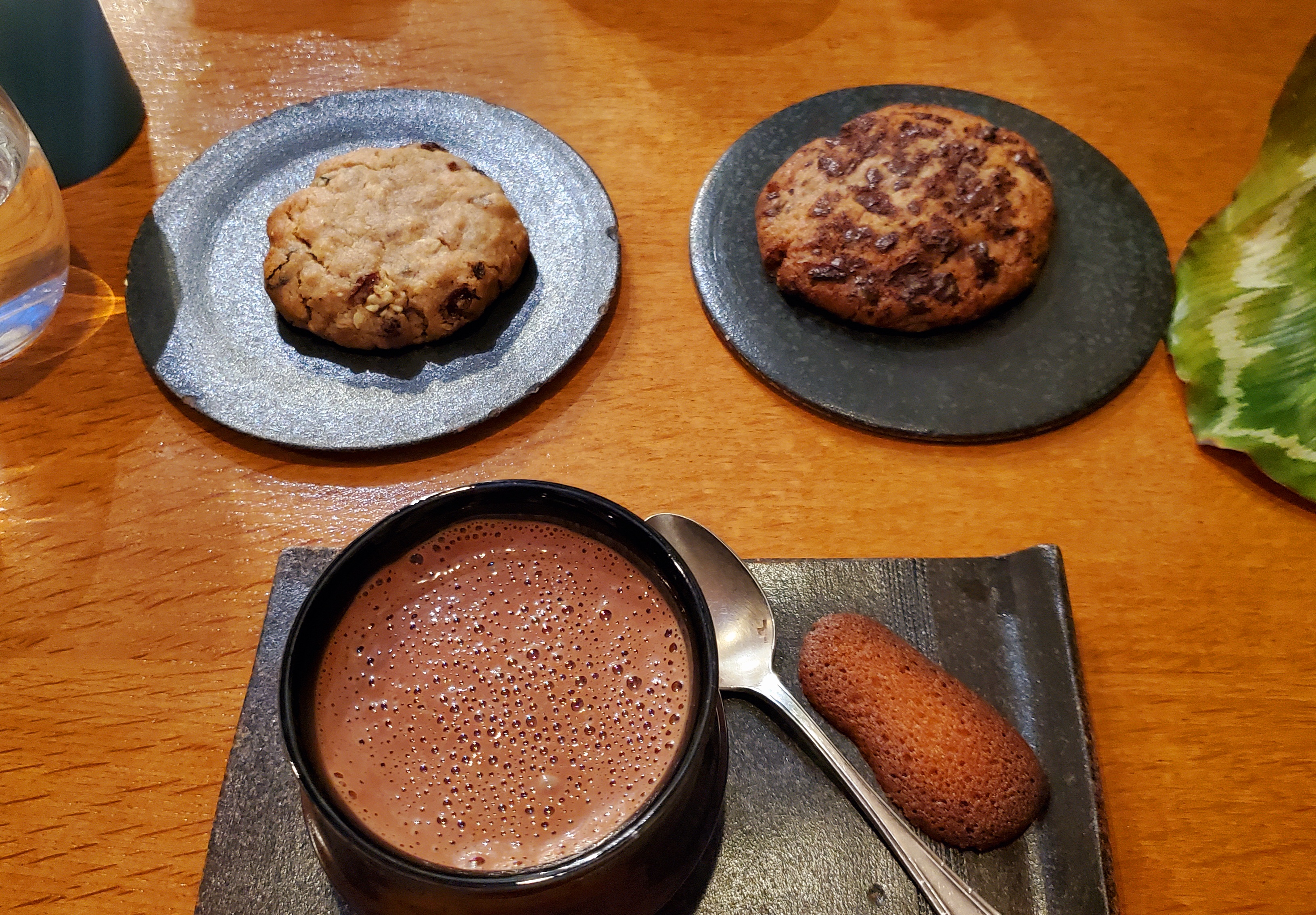 Cadre sympa, cookie délicieux, prix exorbitants et un pseudo chocolat chaud infect, imbuvable. De la vase vomitive! Scandaleux de faire payer si cher quelque chose d'aussi mauvais. Ma compagne a été malade pendant des heures, la nausée. Et quand j'ai goûté le sien, j'ai cru que j'allais le recracher. Quelle idée de faire fondre des tablettes de chocolat ultra-grasses dans une tasse! Ce n'est pas du vrai chocolat chaud. C'est du coulis. Concept à revoir. Et pourtant on est amateurs de vrai cacao sacré péruvien. On a eu aucun choix sur le type de lait qu'on pouvait ajouter. Je n'y retournerai plus jamais.