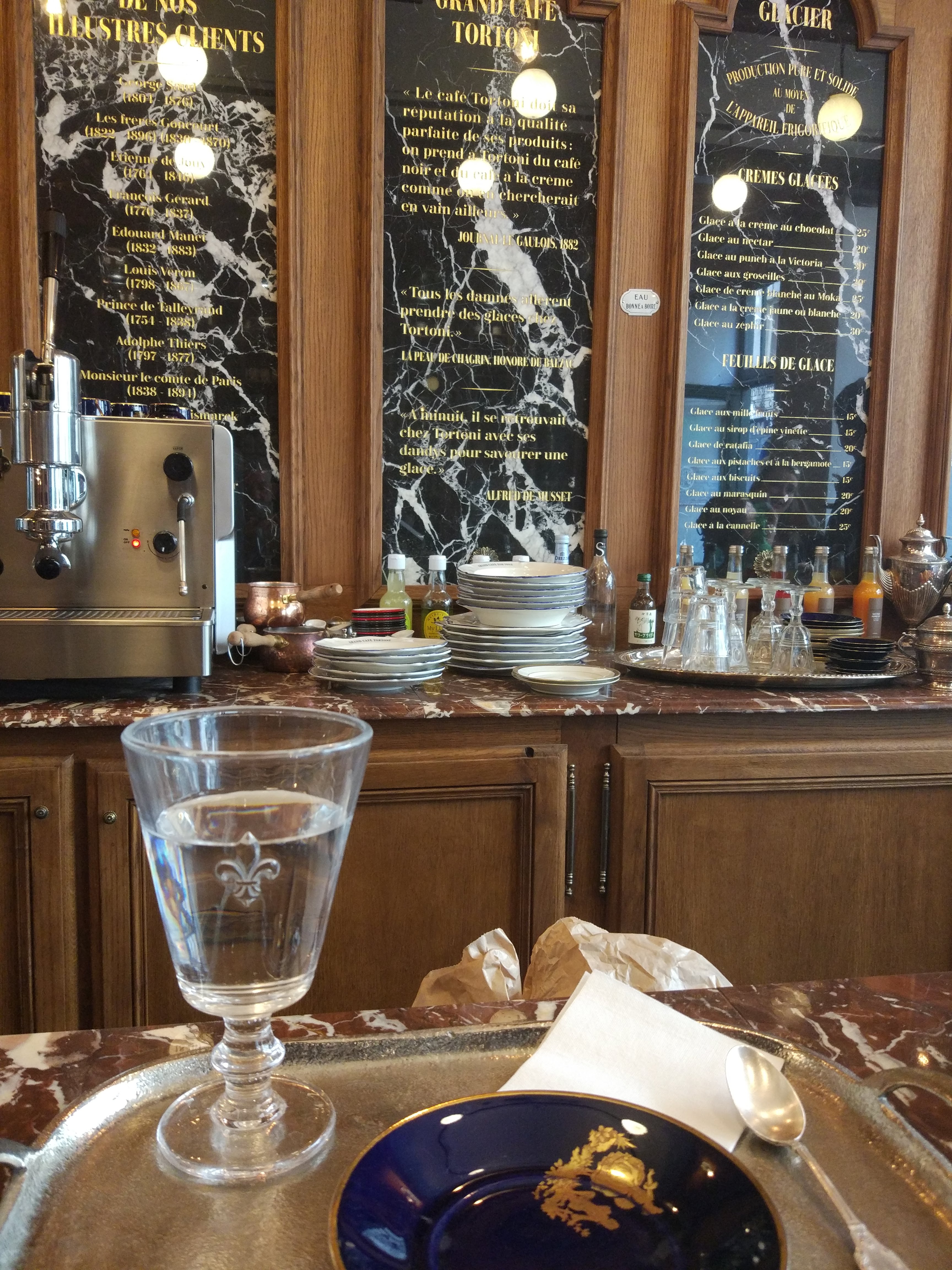 Arrivé dans ce café par hasard, nous n'avons pas été déçu par la découverte : un expresso de grande qualité, un décor unique et des prix imbattables. Le concept Premier Empire est maitrisé à la perfection : des tenues du personnel en passant par la musique, le service à café ou encore le grand comptoir en marbre d'Italie que l'on pourrait croire d'époque ; tout est minutieusement pensé pour nous transporter dans une autre époque, celle de Napoléon 1er et de Joséphine de Beauharnais. Au Grand Café Tortoni, vous êtes comme plongés dans un havre de paix, celui d'une époque révolue et pourtant largement fantasmé : loin, très loin des problématiques du XXIème siècle.